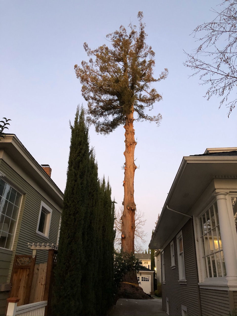 The question then is: how do you remove a 200 foot tree which has four separate houses within a 20 foot radius of its base? Let me answer that pictorially, with the clue that it involves a lot of cranes: