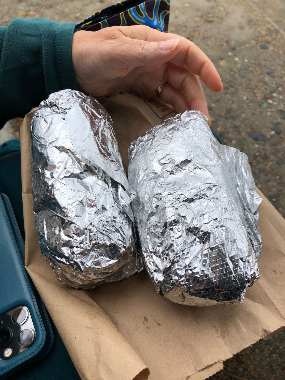 Burritos are the archetypal San Francisco area food; or rather the "Mission burrito" variant which seems to be fairly ubiquitous these days. A breakfast burrito basically has bacon, egg and potato in it as well.