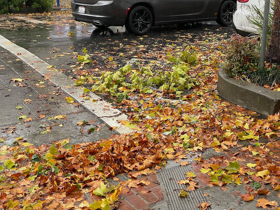 On Sunday, it rained. It rained all day, and then it rained again for part of Monday. It would be an exaggeration to say that 'the rain it raineth every day' (see what I did there reader? Yes, honestly, I think about these blogs, they're not just tossed out like tomorrow's chip paper), but it'd be entirely accurate to say 'the rain it raineth quite consistently for two days running, and you don't get many of them to the pound in these parts'. This was basically what all of October looks like in the UK, but to have it do that here was unexpected, newsworthy, and quite disruptive. The trees here really aren't expecting those kinds of conditions, so my afternoon walk looked like this: