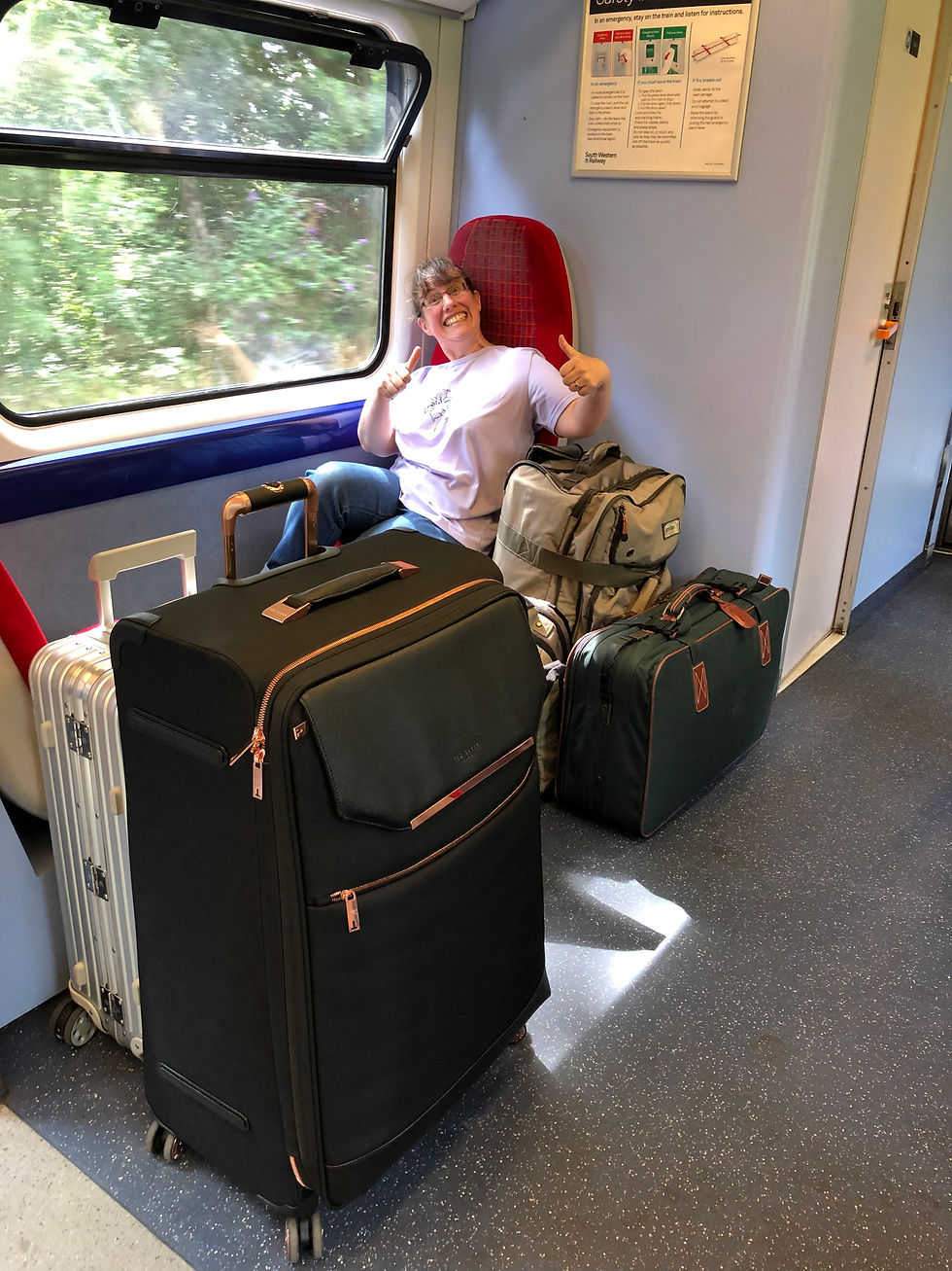 Having packed everything, we said our final goodbyes to family. Then we needed to get rid of our car, and get on a train for a night in a hotel in London. Now it turns out that wheely luggage is great for getting around; not so great for staying still as the train starts and stops.